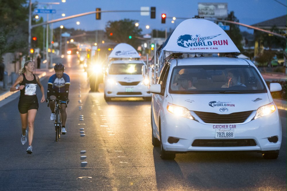 Los Catcher cars están preparados con una nueva tecnología desarrollada espepcificamente para Wings for Life World Run. El ranking local y global de cada participante estará determinado por la distancia que cubran antes de ser adelantados por el Catcher car y no por el tiempo que estuvieron corriendo. Los Catcher cars están gobertnados por el reglamento que asugura un aumento de velocidad justo y simultáneo en los 35 recorridos del mundo. Los dos Catcher cars de las localizaciones alemanas – Munich y Darmstadt – han sido adaptados para conductores con lesiones de médula espinal.
