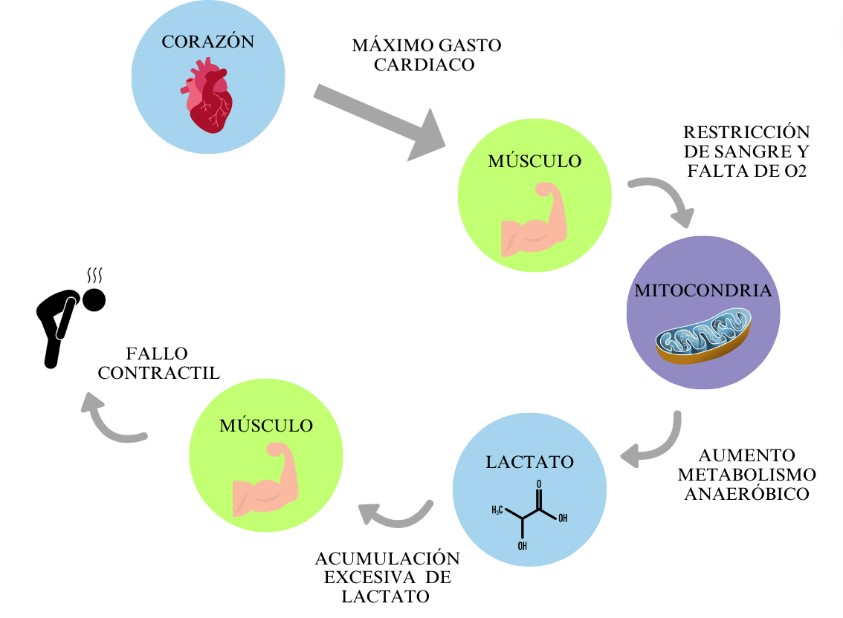 Este modelo fue uno de los pioneros en tratar de dar una razón científica a la aparición de la fatigabilidad. Presentado por Hill (1924), se centra en definir los límites fisiológicos del ejercicio en los seres humanos. El concepto clave es que existe un gasto cardíaco máximo o limitante que no puede ser superado. Existiría entonces un límite de volumen sanguíneo que puede ser bombeado hacia los músculos en ejercicio. Durante el ejercicio hasta el agotamiento, la demanda de flujo sanguíneo de los músculos excede esta tasa máxima, por lo tanto, los músculos se ven obligados a generar la energía principalmente por la vía anaeróbica, lo que genera una producción excesiva de lactato. Este lactato inhibiría la contracción muscular y obligaría a la finalización de la tarea. Ver figura 2.