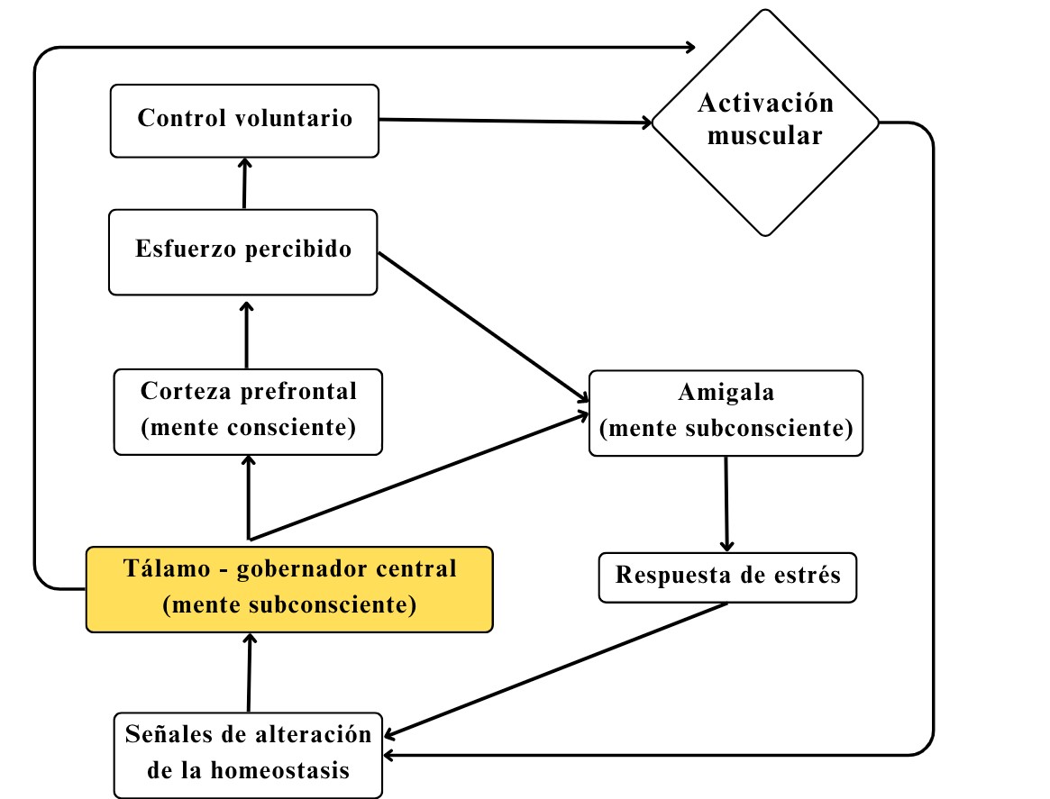 La neurociencia parece corroborar esta hipótesis. Agentes estresores de tipo fisiológico, ambiental o químico provocan síntomas somáticos que son detectados por el tálamo. Esta área cerebral hace la función de antena receptora y a su vez envía esta información a otras zonas del cerebro, principalmente la amígdala, que se encarga de provocar respuestas a nivel hormonal y de neurotransmisores. Si el estresor es muy grande, el tálamo interpretará que la homeostasis está siendo peligrosamente alterada, entonces estimulará a la amígdala para que se provoquen respuestas de estrés que nos conduzcan a la parada del ejercicio físico y evitar de esta manera el daño excesivo de los tejidos. Esto se ha demostrado experimentalmente con modelos animales donde se extraía la amígdala a ratones y éstos eran capaces de aumentar significativamente el tiempo de ejercicio en test hasta el agotamiento (Tsukioka et al., 2022). No obstante, el tálamo también envía señales a zonas del cerebro encargadas de generar lo que conocemos como mente consciente. Una de estas zonas sería la corteza prefrontal. Esta región cerebral es la encargada de la coordinación de pensamientos y acciones de acuerdo con metas internas y también de interpretar la percepción de esfuerzo y de fatiga. La corteza prefrontal, si interpreta que está aumentando la percepción de esfuerzo enviará información hacia la amígdala para que magnifique la señal de estrés y detenga la actividad. Pero también es sensible a las respuestas de la amígdala, ya que los estresores aumentan, lo cual genera un círculo vicioso que acabará con la finalización de la tarea. Sin embargo, si somos capaces de atenuar esta señal de alarma desde la mente consciente, potencialmente seremos capaces de continuar con la intensidad pautada durante más tiempo. A modo de resumen, el tálamo podría ejercer la función del gobernador central, el cual envía señales a la amígdala para que genere respuestas de estrés fisiológicas (sobre las que no podemos actuar) y a la corteza prefrontal, la cual lo traducirá mediante la mente consciente en percepción de esfuerzo y podrá activar aún más a la amígdala. Ver figura 5.