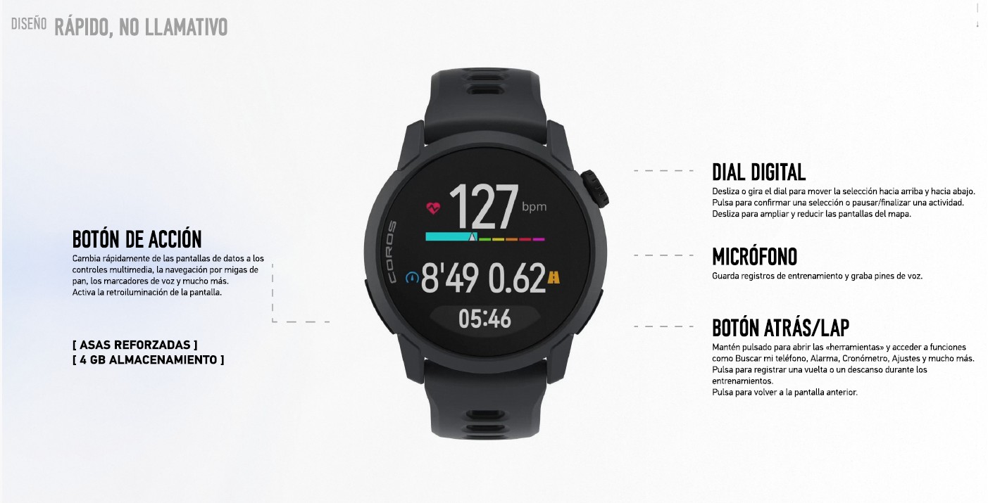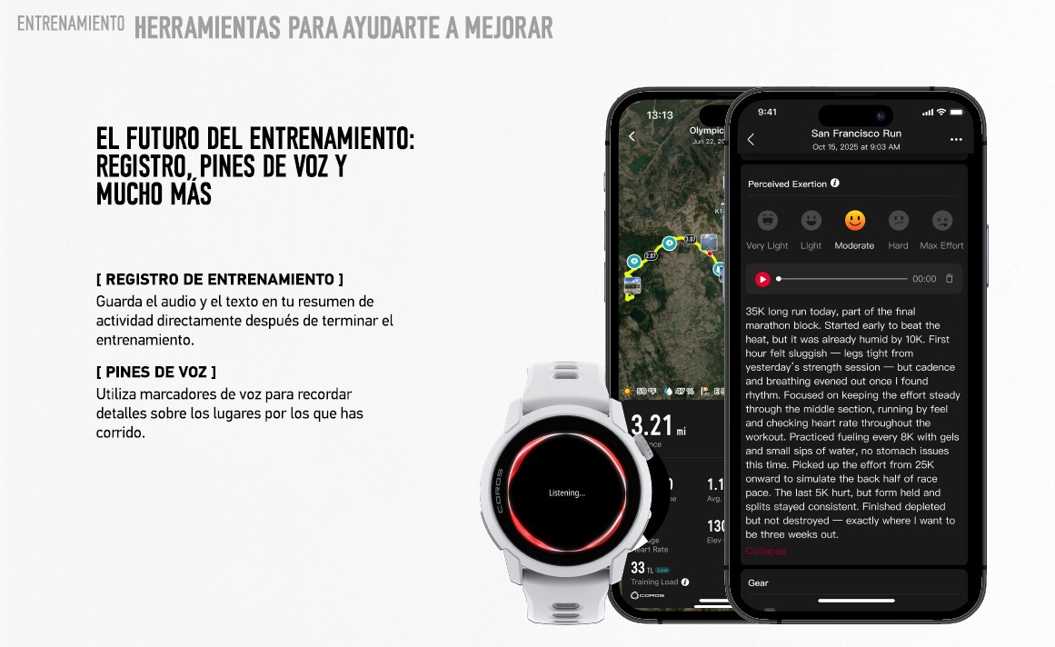 - Funciones de voz: graba registros de entrenamiento y captura notas de voz con el micrófono integrado, lo que facilita a los atletas el seguimiento de la información crucial del entrenamiento sobre la marcha.