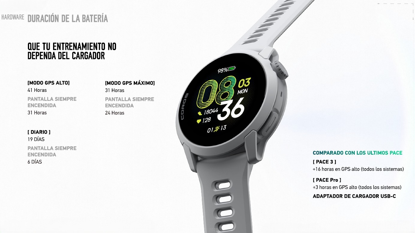 - Gran autonomía: con hasta 41 horas de GPS y 19 días de uso diario, PACE 4 mejora la autonomía en 16 horas adicionales de uso del GPS en comparación con la ya reconocida autonomía de PACE 3.