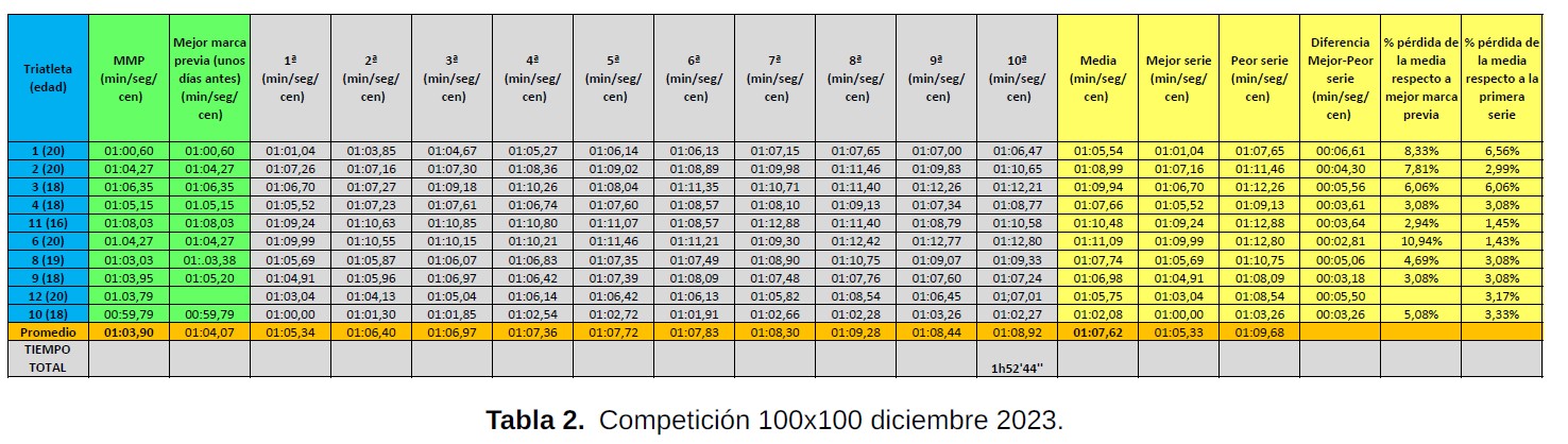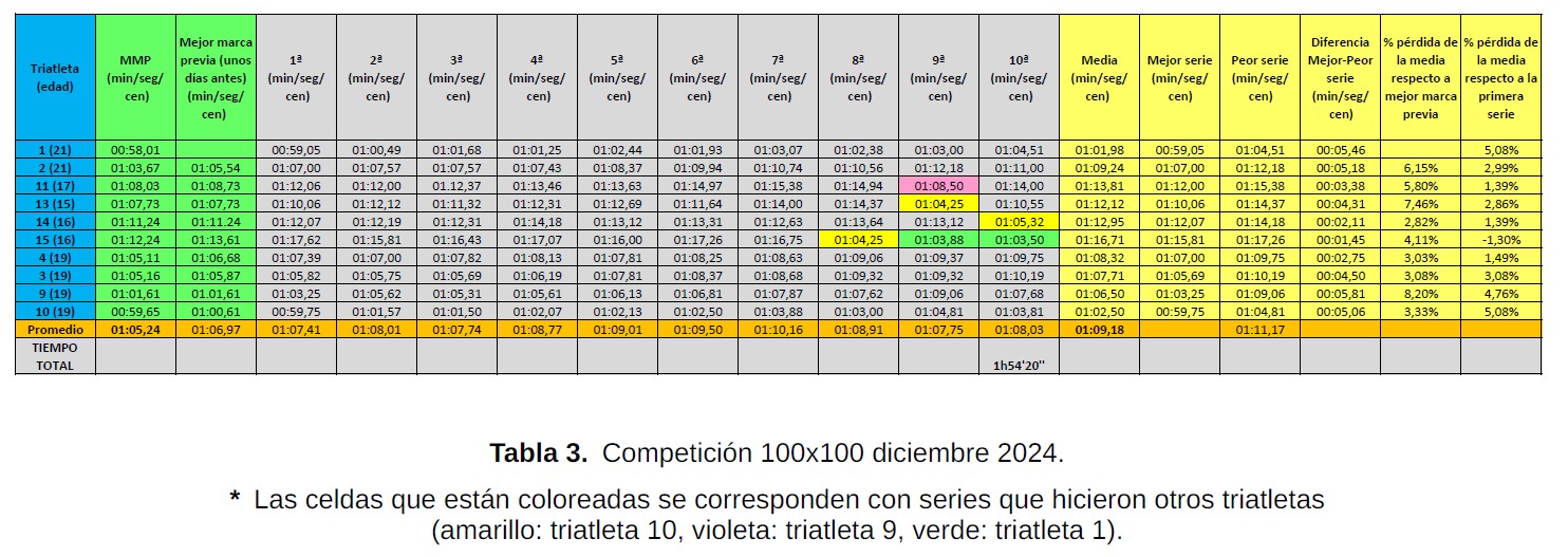 - En la tabla 3 (competición 2024), vemos algunas celdas coloreadas. Esto es porque en algunas series finales se dio descanso a los triatletas más jóvenes y en su lugar nadaron otros compañeros, los cuales doblaron esa serie, es decir, hicieron su posta y otra más. A la hora del análisis, esto se debe tener en cuenta en los triatletas que doblaron, ya que su grado de fatiga se ve aumentado tanto por haber realizado más series como por haber tenido menor tiempo de descanso entre ellas.