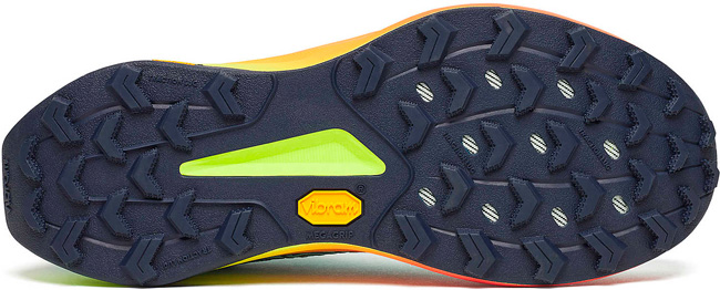 Respecto de las últimas versiones Peregrine, Saucony ha optado por cambiar su exclusiva suela PWRTRACK, de producción propia y eficaz resultado (salvo algunas mermas por durabilidad en alguna tirada de pasados modelos), por la exitosa goma MEGAGRIP de la prestigiosa casa Vibram. Conocemos bien esta suela, se trata de una herramienta de precisión en los pies de corredores con buena técnica en trepadas y canchales. Mediante esta goma las Peregrine 16 aseguran una excelente adherencia en las placas de roca más inclinadas, incluso en mojado. Mientras que la disposición en uve de los tacos, contrapuesta en mediopié (26 tacos) frente a talón (14 tacos), optimizan la tracción a favor o en contra, según sea área de despegue o de frenado. Tacos espaciados con una prominencia de 4mm y un tamaño de superficie medio, ofrecen solvencia a la zapatilla en terrenos blandos, evitando en parte la formación de zuecos de barro. A la vez que aseguran la durabilidad de la suela frente a los mordiscos de la roca. Pensando en los aterrizajes sobre piedras picudas o raíces, Saucony inserta su clásica plancha antipunción entre suela y mediasuela del antepié. Garantía de salvaguarda plantar.