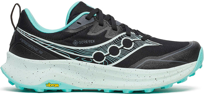 Pensando en escenarios mojados e invernales, Saucony propone la opción Peregrine 16 con membrana Gore-Tex. Por tanto, disponemos de las Peregrine 16 “tres estaciones” y una versión GTX destinada a la temporada invernal. Es idéntica a la versión “estándar”, pero impermeable, a la par que transpirable, gracias a la eficaz membrana Gore-Tex que reviste todo el upper. Aumenta mínimo gramaje sobre la báscula. Ahora bien, el hecho de que unas zapatillas sean impermeables/transpirables no impedirá que acabes con los pies encharcados, a no ser que utilices polainas. Sin ellas, las salpicaduras al cruzar charcos y tramos de nieve entrarán a través del cuello de la zapatilla. En nuestra opinión, toda zapatilla con membrana Gore-Tex, o de similar prestación, debería integrar polaina como parte de la zapatilla. Es la mejor fórmula para un resultado estanco. En todo caso, las Peregrine disponen de anilla delantera donde fijar polainas, que igualmente deberán ser impermeables y transpirables. Ojo, si entran salpicaduras de agua o nieve a través de la boca de la zapatilla, sea por no usar polainas, o porque no ajusten bien, el tejido Gore-Tex no drenará el líquido del interior de las zapatillas. Modesta sugerencia a Saucony: incluyan polainas integradas en las próximas Peregrine GTX. No tendrán competencia como zapatillas casi “voladoras” de uso invernal.