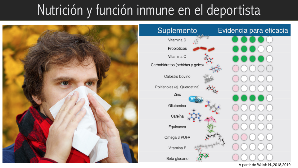 En cuanto a los suplementos, la mayoría de los datos que apoyan su uso sobre la inmunidad provienen de estudios realizados en personas con inmunidad comprometida. Esto nos daría a pensar que poco puede hacer por ti un suplemento si tienes niveles adecuados de los nutrientes que aporta. Sin embargo, existen varios escenarios del mundo real en el deportista y datos que señalan a que algunos de ellos pueden desempeñar un papel relevantes. Por ejemplo, en situaciones donde la ingesta de energía, macro y micronutrientes puede ser insuficiente, como en el caso de dietas para pérdida de peso, o en momentos durante los cuales puede existir un descenso de la inmunidad y/o mayor exposición a patógenos, como ocurre en viajes al extranjero, competiciones o entrenamiento durante el invierno.